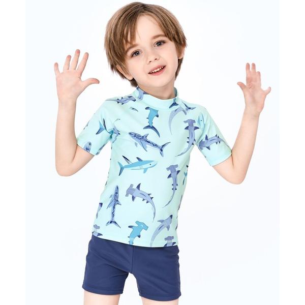 水着 キッズ水着 ミントシャークラッシュガードトップス+ショートパンツ+スイムキャップ 3点セット キッズ 子供 男の子