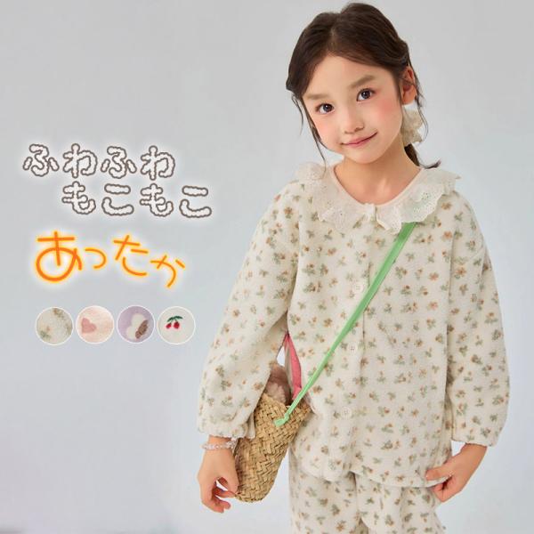 キッズ パジャマ 長袖 女の子 セットアップ セパレート トップス パンツ 2点セット 起毛 もこもこ 防寒 あたたか 花柄 リボン柄 レース