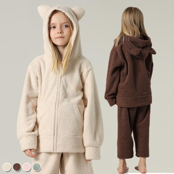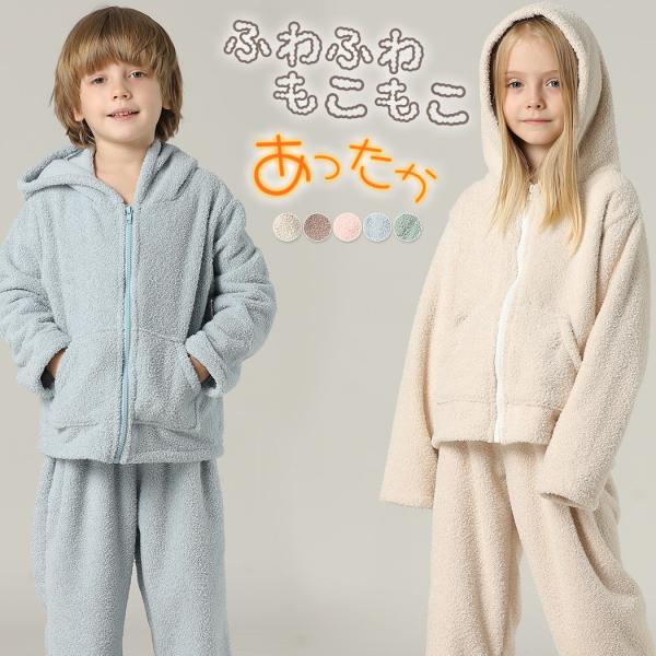 キッズ パジャマ 長袖 男の子 女の子 ユニセックス 上下セット 2点セット もこもこ 起毛 防寒 ルームウェア トップス ボトムス フード 秋冬