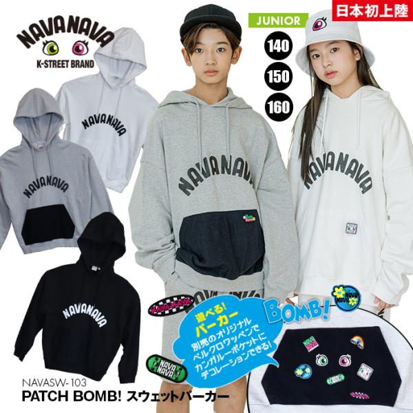 NAVANAVA NAVASW-103 / ナバナバ PATCH BOMB! スウェットパーカー NAVASW-103日本初上陸!!! おしゃれ大国、韓国発のジュニア向けストリートファッションブランド、ナバナバよりカンガルーポケッ...