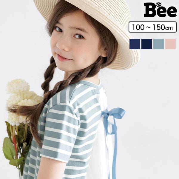 韓国子供服 韓国子ども服 韓国こども服 Bee カジュアル ナチュラル キッズ 女の子 チュニック プルオーバー レース 後ろリボン ボーダー 半袖 春 夏 90 100 110 120 130 140 ◇半袖トップス◇