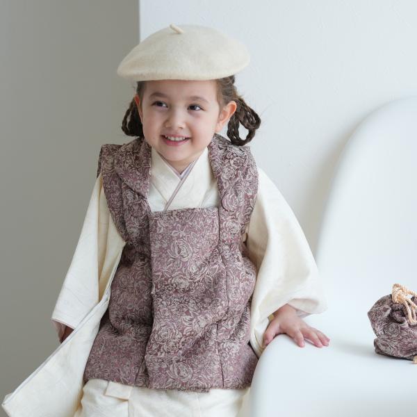 七五三 着物 3歳 女の子 ひよこ商店 kids ベレー帽つき被布フルセット ゴブラン調ジャガード&コットンジャガード ローズブラウン×アイボリー レトロ