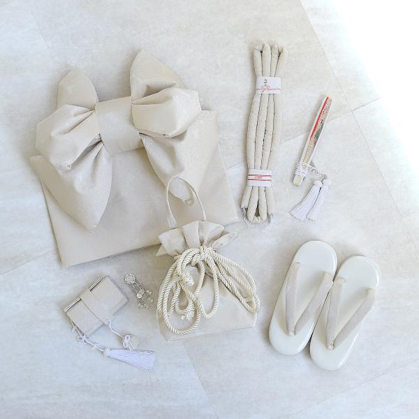 七五三の7歳女の子にぴったりな四つ身着物用の小物セットです。着付けがしやすい結び帯(作り帯)と、晴れの日を彩る筥迫・扇子・帯締め(丸ぐけ)など必要なものが揃っています。【セ...