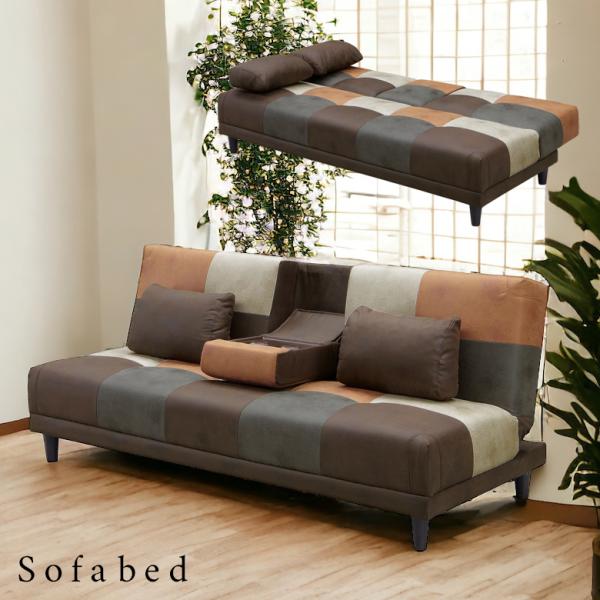 ■商品の特徴パッチワーク風デザインがアクセントのソファベッド。革の風合いを残したレザーファブリックを使用。便利なカップホルダー&テーブル付きです。ライフスタイルに合わ...