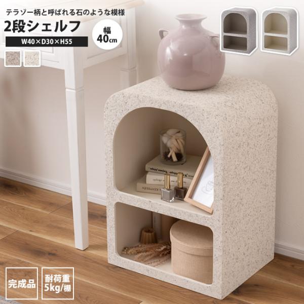 シェルフ2段 おしゃれ 幅40 角丸型 テラゾー柄 石目調 石模様 マーブル リビング収納 本棚 MAR-12 WH/LGY
