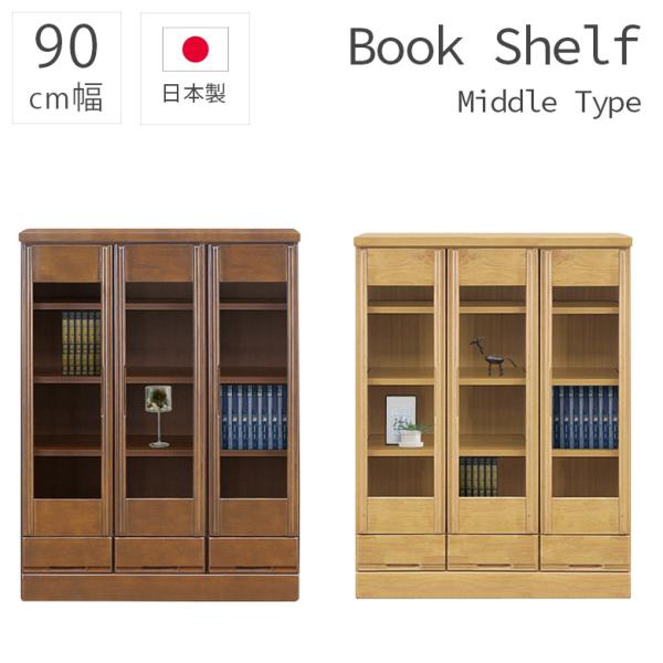 書棚 ブックシェルフ 幅90cm 引出付き 90幅 引出し収納 大容量 本棚 扉収納 日本製 ラバーウッド ミドルタイプ 引出し 開き扉 国産