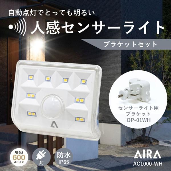 【品番】AC-1000WH-OP01【商品名】Aira LEDセンサーライト AC ブラケットセット【電源】AC100V (50/60Hz) コンセント式 (電気工事不要)【消費電力】約6W (点灯時)【光源】白色LED【明るさ (全光束)】...