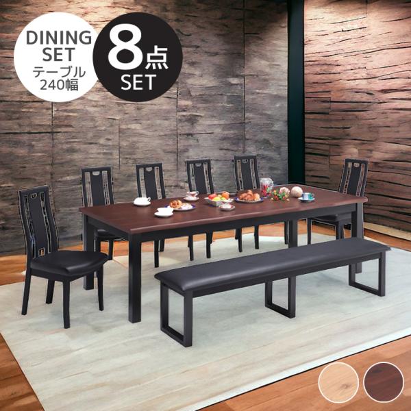 ダイニングテーブルセット 10人掛け テーブル 幅240 8点セット ベンチセット 長椅子 チェア6脚 ベンチ オーク 突板 ラバーウッド無垢 ダイニングテーブル