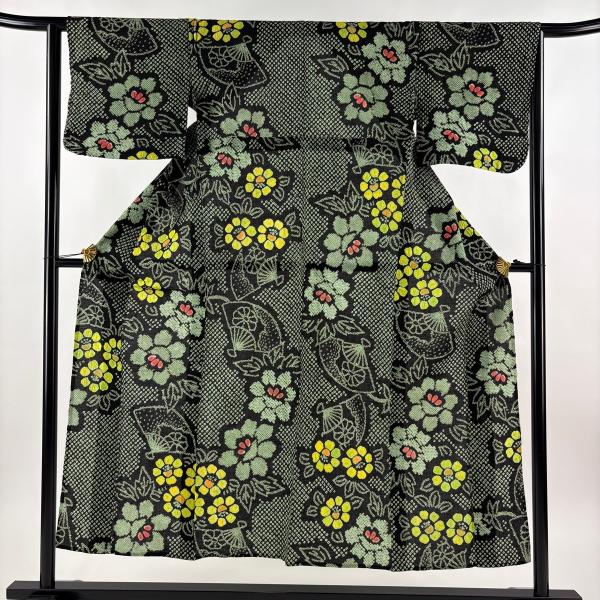 美品 浴衣 身丈151cm 裄丈63cm S 絞り浴衣 扇 草花 緑 綿 名品 中古