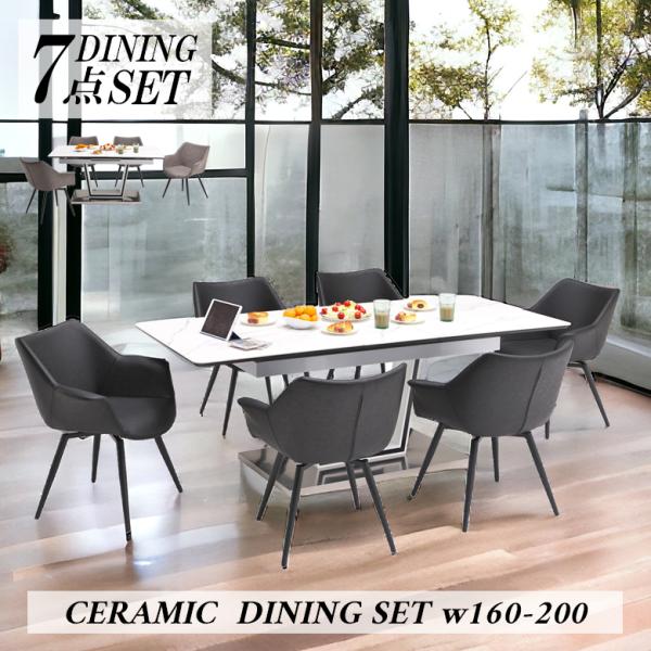 ダイニングテーブルセット 6人掛け 伸長式 幅160 幅200 7点セット 伸長式テーブル 6人 伸長 セラミックテーブル チェア セット 石目調 白 グレー ホワイト