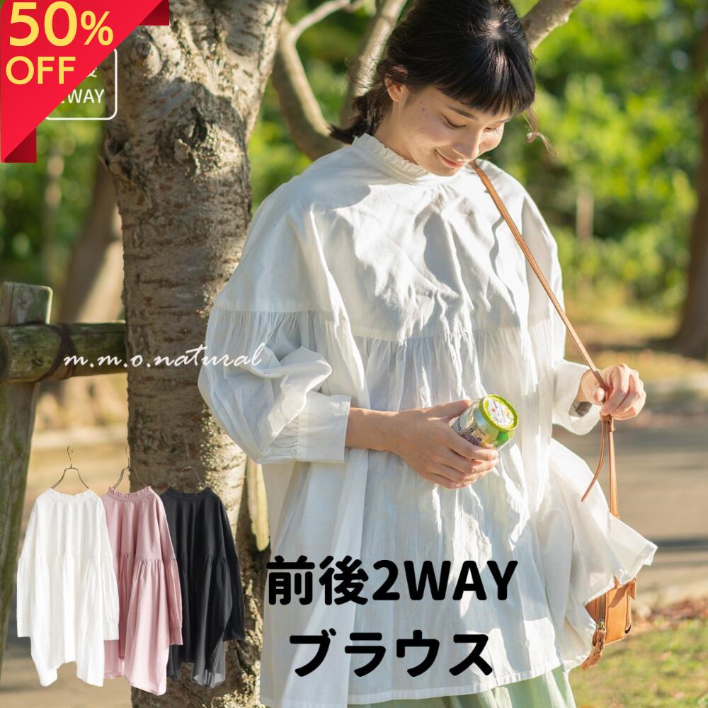 【50%OFF】【楽天スーパーSALE価格! 12/4(木)20:00~12/11(木)1:59】m.m.o.前後2WAYブラウス レディーストップス ブラウス 春夏 インド 綿100% 長袖 ゆったり ナチュラル コットン体型カバー 二の腕カバー オフホワイト/ピンク/チャコール M〜L