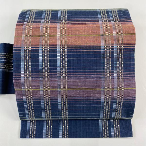 美品 名古屋帯 逸品 証紙あり 南風原花織 縞 紺色 正絹 中古