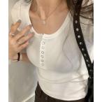 tシャツ スナップボタンヘンリーネックコンパクトトップス レディース