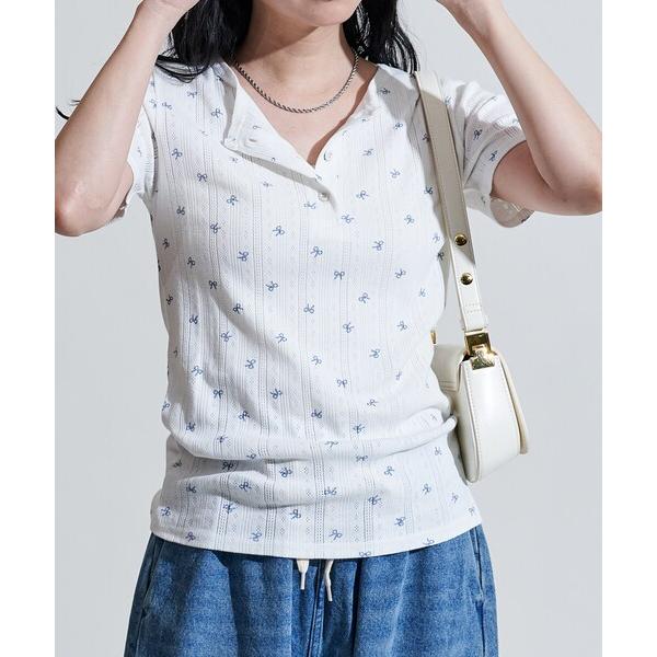 tシャツ リボン柄 針抜きフライス ヘンリーネックTシャツ レディース