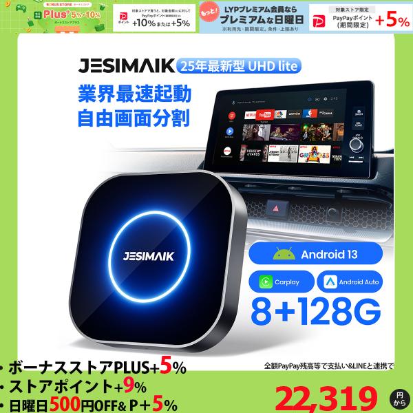 「48時限定★ボーナスplus+14%」業界最速起動 Carplay AiBox JESIMAIK UHDlite カープレイ Android13.0 CarPlay Android Auto搭載 ワイヤレス 自由画面 512GB