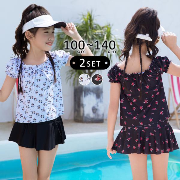 メール便送料無料 水着通販ストア キッズ 水着 女の子 セパレート トップス 半袖 パフスリーブ スカート ショートパンツ一体型 2点セット 花柄 無地 フリル フレア リボン 裏地付き パ...