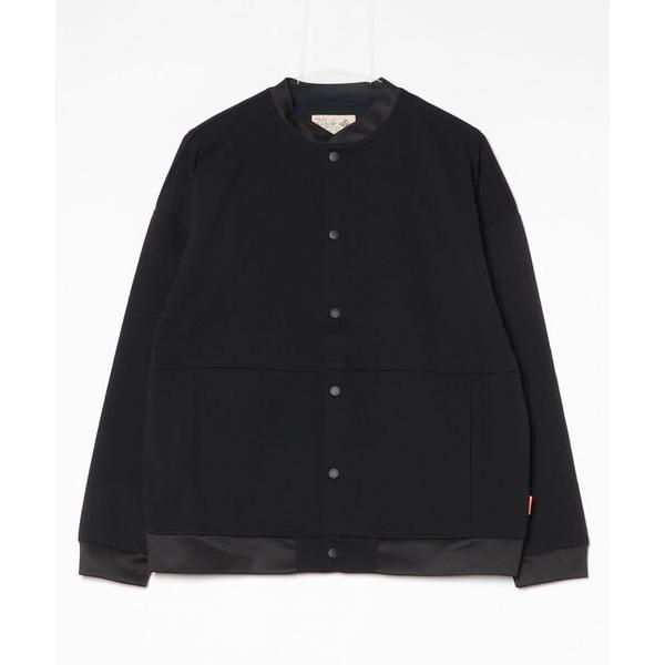 杢調ニットのプラクティスジャケットの提案。ロゴプリントと統一したカン止め配色や裾の平ゴム仕様などが、ディテールへのこだわりを見せます。生地はワントーンでまとめ、ストレ...