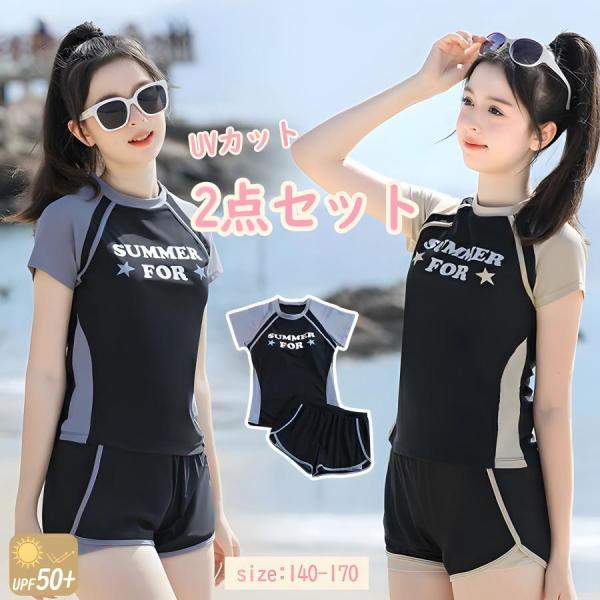 水着 キッズ スクール水着 プール 女の子 女児 レギンス ラッシュガード セパレート クルーネック 2点セット 半袖 ショートパンツ ハーフパンツ スイムスーツ UV