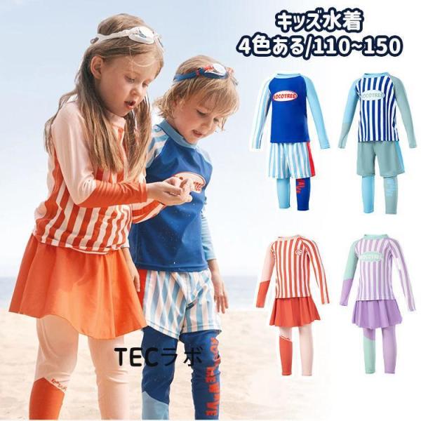 4色 こども フィットネス水着 兄妹お揃い キッズ 長袖 レギンス ショートパンツ スカート 日焼け防止 露出控えめ ジュニア ネービー ストライプ ブルー オレン
