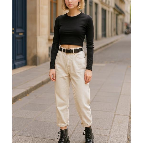 ジーンズ デニム デニムパンツ カラーステッチロールアップハイウエストデニムパンツ レディース