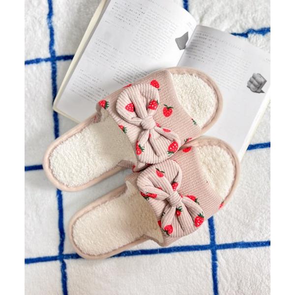 スリッパ 「26年春夏新作」イチゴ柄リボン コーデュロイスリッパ