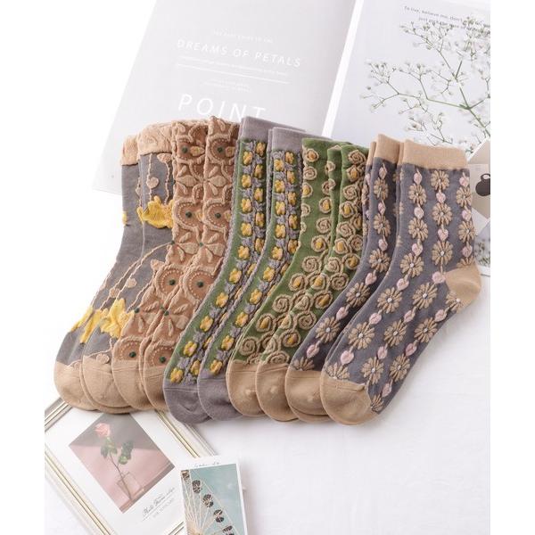 靴下 「10足セット」 レトロ 立体 フラワー レリーフ クルー丈 ソックス レディース