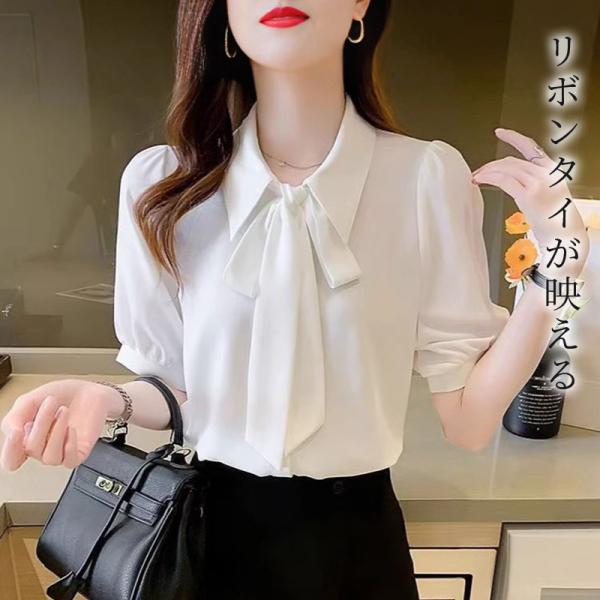 ブラウス オフィス 半袖 レディース トップス きれいめ ボウタイブラウス リボンタイ パフスリーブ ボタン 薄手 無地 白 ギフト プレゼント