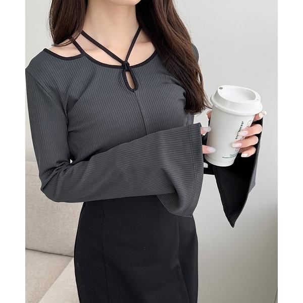 ニット セーター 「mily bilet」程よい肌見せで女性らしく。チョーカー使いパイピング配色袖フレアカットソー レディース