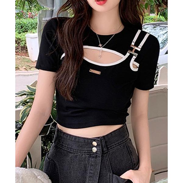 tシャツ 胸元カットアウト配色バインダーショート丈Tシャツ レディース