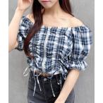 ブラウス シャツ チェック柄ドロストジップオフショルブラウス レディース