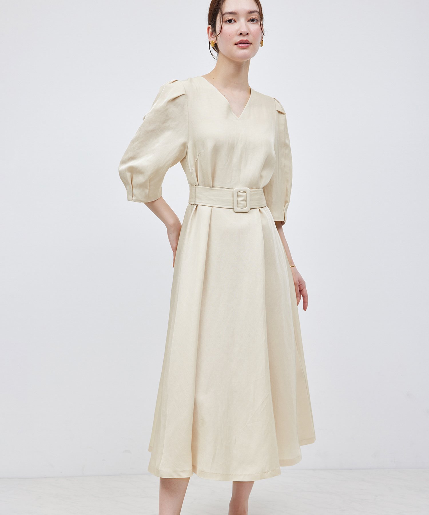 【SALE/50%OFF】ROPE' パフスリーブベルテッドリネンワンピース ロペ ワンピース・ドレス ワンピース カーキグリーン ベージュ【送料無料】