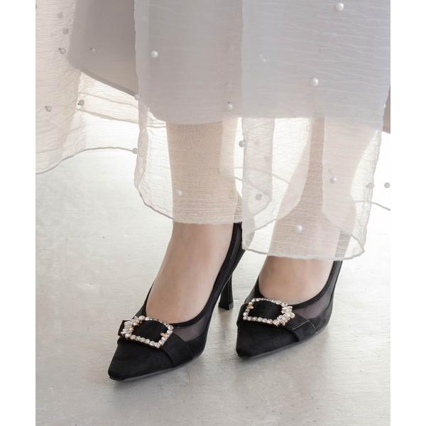 パンプス チュールコンビビジューバックルパンプス