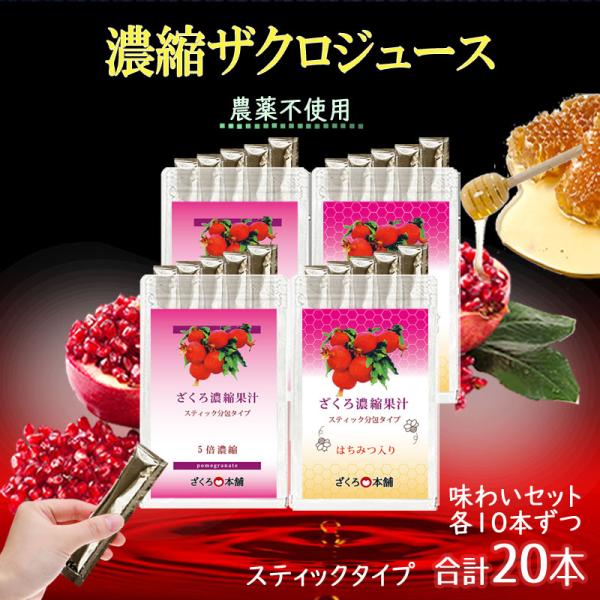 【50%OFF】濃縮 ザクロジュース 味わいセット スティック 20本 5倍濃縮ざくろ果汁 蜂蜜入り濃縮ざくろジュース 各10本の計20本