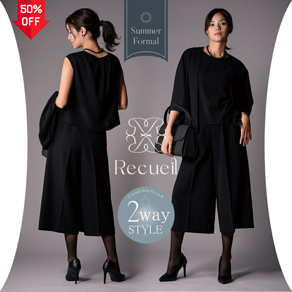 【期間限定 数量限定50%OFF】ブラックフォーマル 夏用 洗える レディース 喪服 パンツスーツ ワイドパンツ クロップド 袖なし タンクトップ 3点セット スタイリング 着回し M/L/LL【5558009】