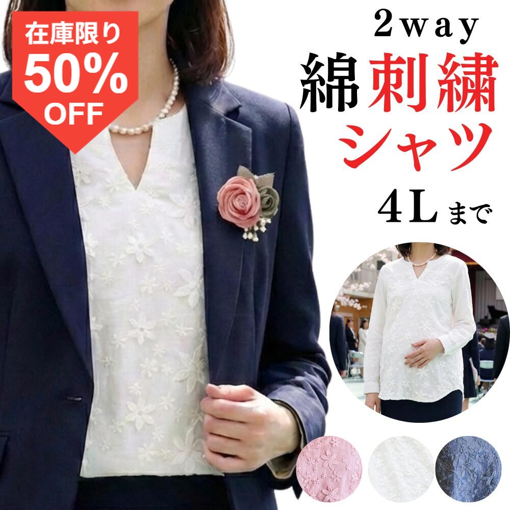 \50%OFF/卒業式 入学式 ブラウス シャツ 刺繍 レース インナー レディース スーツ インナー 長袖 白 紺 ピンク 綿 コットン 大きいサイズ 4L マタニティ フォーマル ママ 母親 服装 30代 40代 50代 60代 70代 ゆったり【売れ筋】