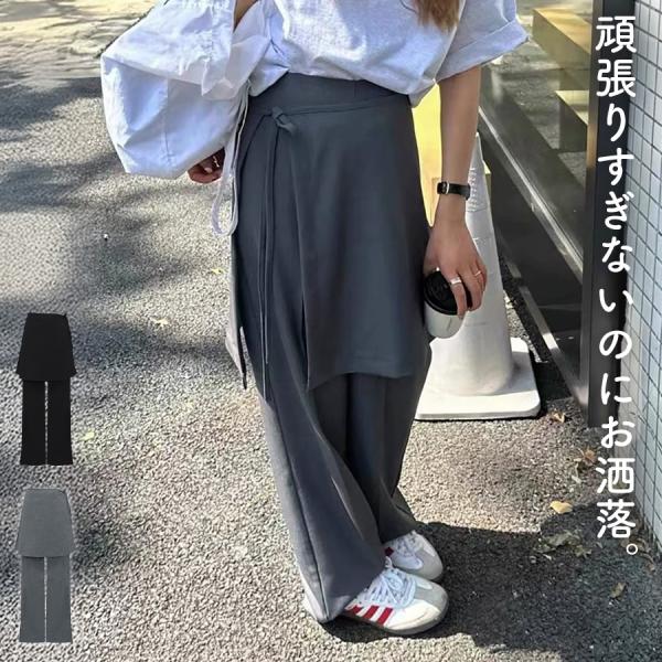 スラックス ラップスカート 2点 セット ワイドパンツ レイヤード スカート レディース きれいめ ボトムス ロング 薄手 黒 春 夏 秋