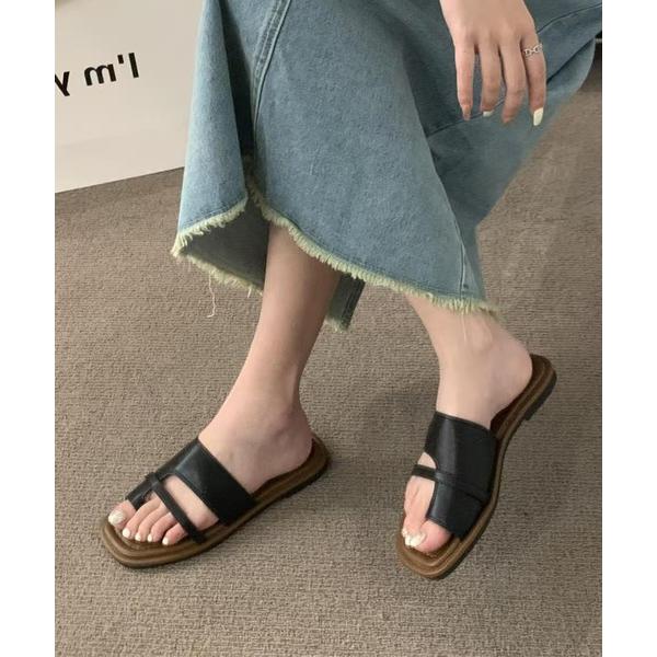 サンダル レザー調 スクエアトゥ 親指トング フラット サンダル レディース
