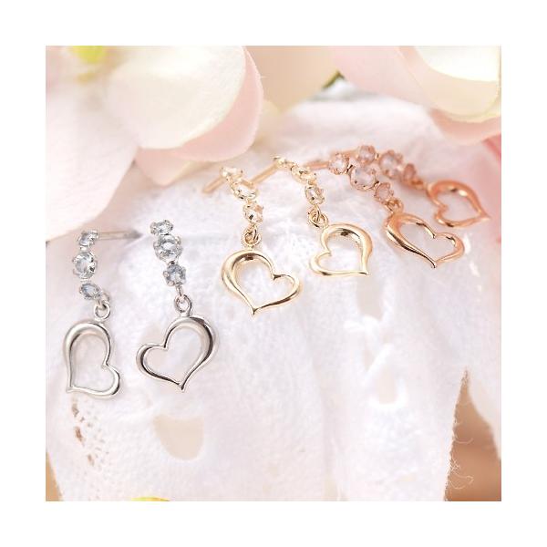 K10WG、K10、K10PG、オープンハートが揺れ動くC型3連天然石のピアス、ホワイトゴールドとアクアマリン、ゴールドとブルームーンストーン、ピンクゴールドとローズクォーツ、パワースト...