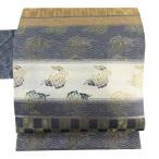 美品 名古屋帯 秀品 荒磯 市松 金糸 灰紫 正絹 中古