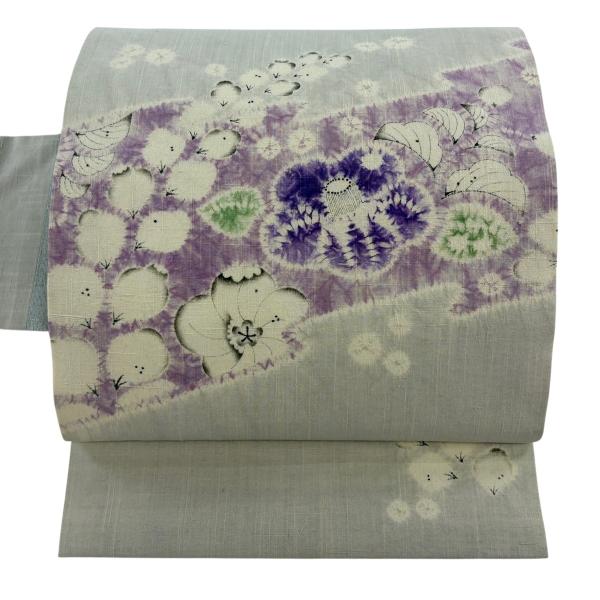 美品 名古屋帯 逸品 落款あり 紬地 小倉健亮 辻が花 灰色 正絹 中古