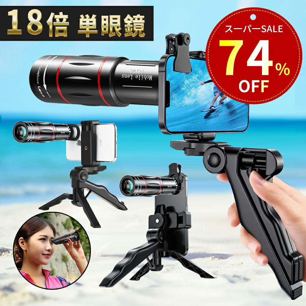 \特別セ一ル!73%OFF&100円クーポン!/単眼鏡 望遠鏡 スマホ 望遠レンズ 高倍率18倍 94g軽量 【多機能三脚付属】 スマホに簡単装着 スマホカメラレンズ 専用アイカップ ストラップ 高級プリズムBak4 望遠レンズ 小型 携帯 子供 誕生日