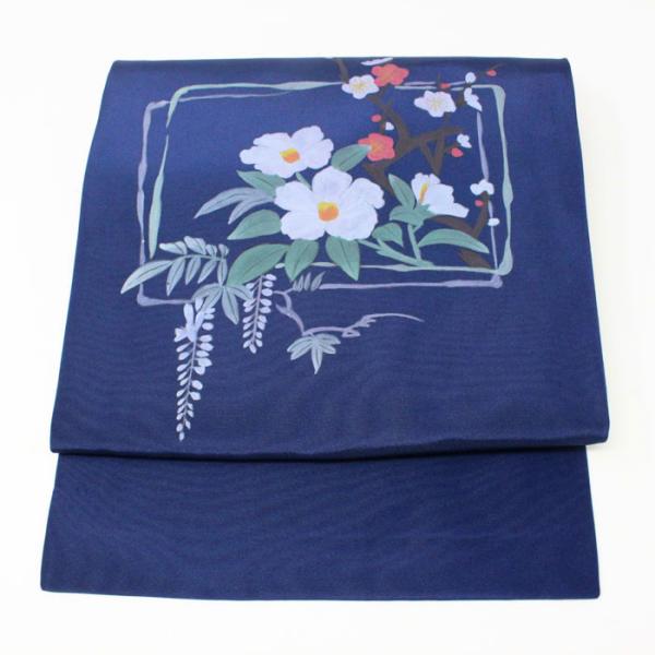 ポリエステル 100%巾30.5cm 長さ約360cm(仕立上)紺色の塩瀬地に梅、椿の手描き模様。