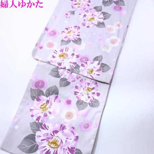 セール 婦人 ゆかた グレー地 パープル 椿 梅 レディース 婦人 浴衣 単品 山本彩 綿 5p