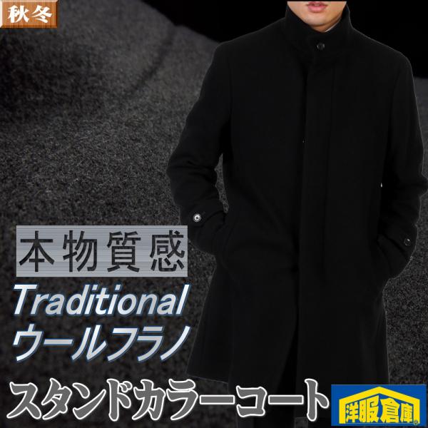 【トライアウトコート】スタンドカラー コート メンズ トラディショナルウールフラノ素材 スタイリッシュ ブラック無地 26000 RC3614