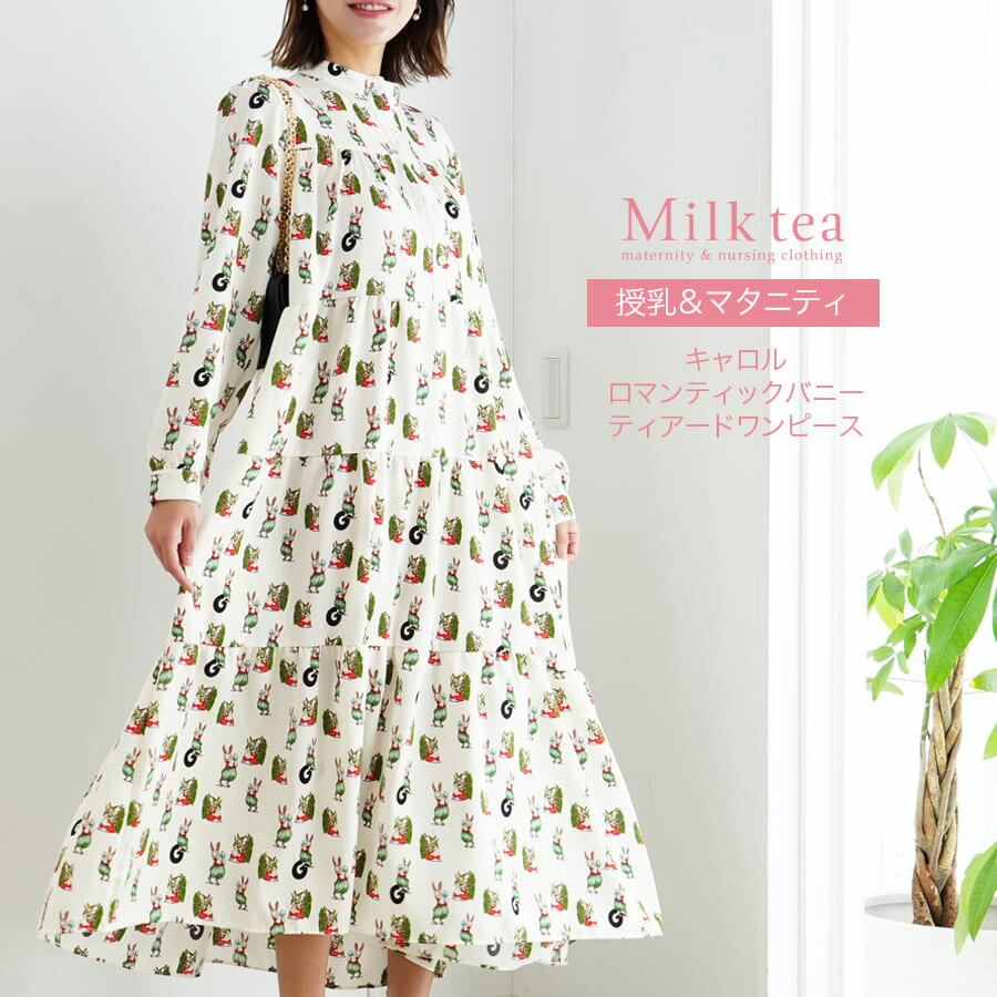 【楽天スーパーSALE50%OFF】<授乳服・マタニティウエア>キャロル・ロマンティックバニー・ティアードワンピース(ボタンタイプの授乳口)【AVERY COLLECTION】 妊娠 出産 産前 産後 ラビット柄 総柄 長袖 Milk tea