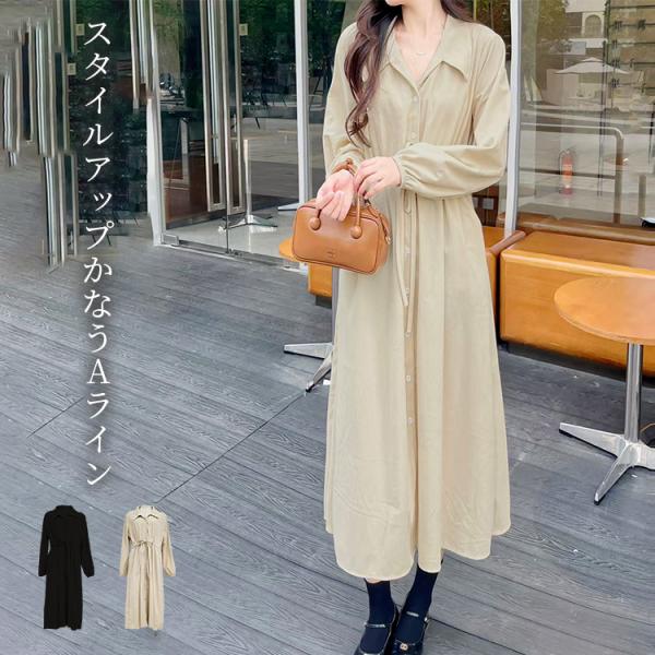 送料無料 翌日配達 あすつく「ドレープ風に仕立てる」シャツワンピース 長袖 きれいめ レディース ゆったり ロングワンピース コーデュロイ Aライン オープンカラー 前開き ボタン ギ...