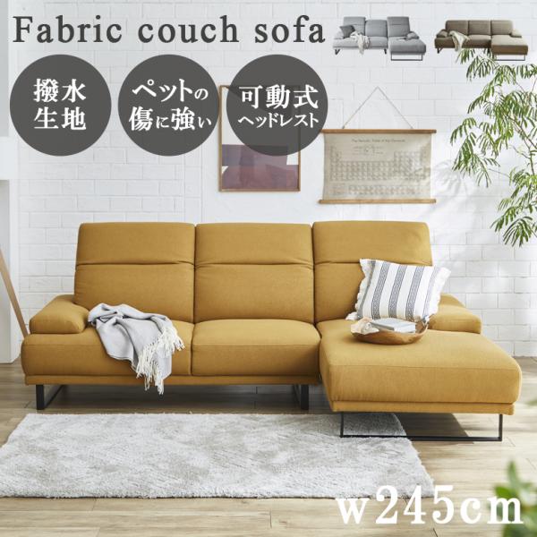 カウチソファ 3人掛け 幅245cm ヘッドレスト 可動式 ソファ カウチ おしゃれ 北欧 背もたれ 撥水加工 ファブリック 猫キズ ソファー ウレタンフォーム アイアン