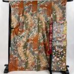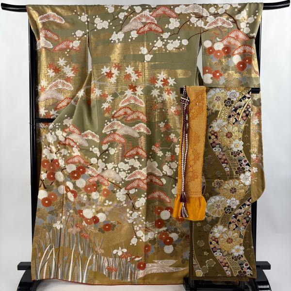 振袖 身丈168cm 裄丈68cm L 袷 袋帯フルセット 松梅 菊 金糸 金彩 灰緑 正絹 秀品 中古