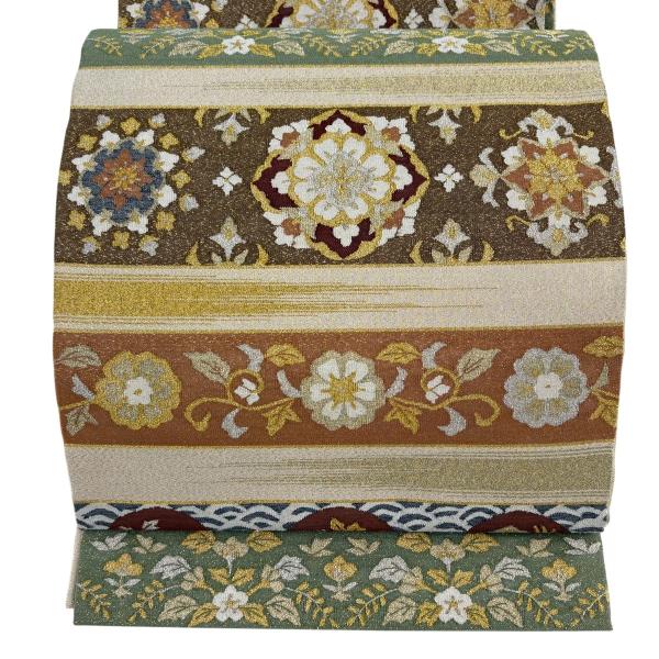 美品 袋帯 逸品 綴れ 華文 花唐草 金銀糸 金通し ベージュ 全通 正絹 中古