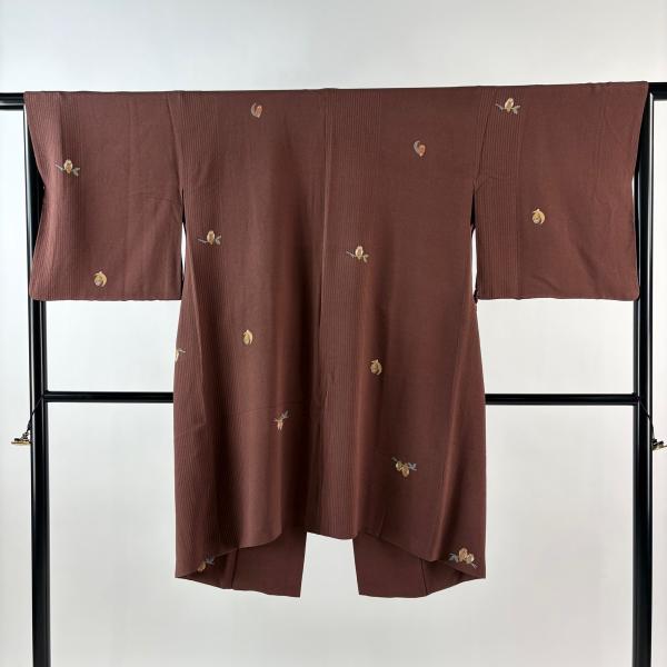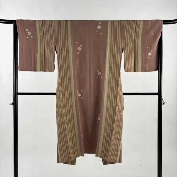 道中着 身丈101.5cm 裄丈65.5cm M 和装コート ふくろう 縦縞 茶色 正絹 逸品 中古